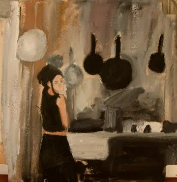 A monochrome figurative painting portraying a quiet interior scene in the Saidoff kitchen. Soft, painterly brushwork and a restrained palette create an intimate atmosphere, focusing on the relationship between the solitary figure and the domestic space.