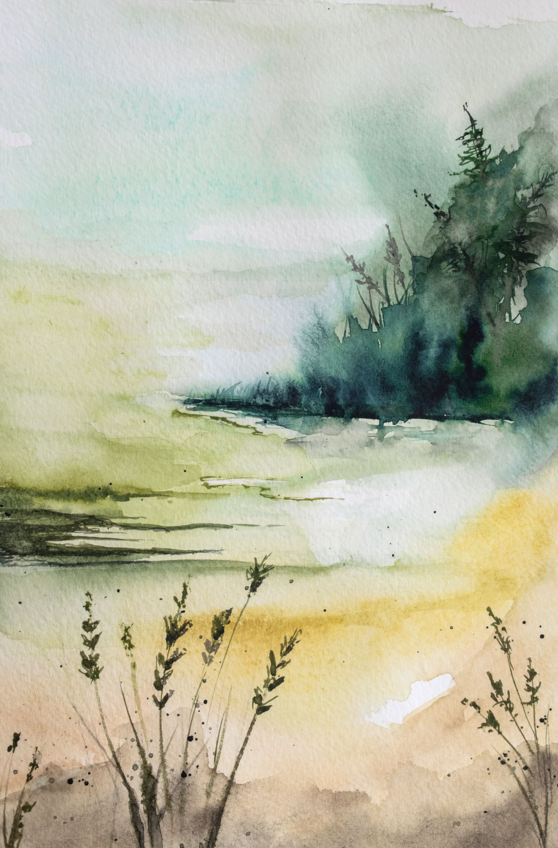 Abstract minimalist watercolor landscape of green growth by a calm spring, in soft, airy tones of green, beige, and blue.