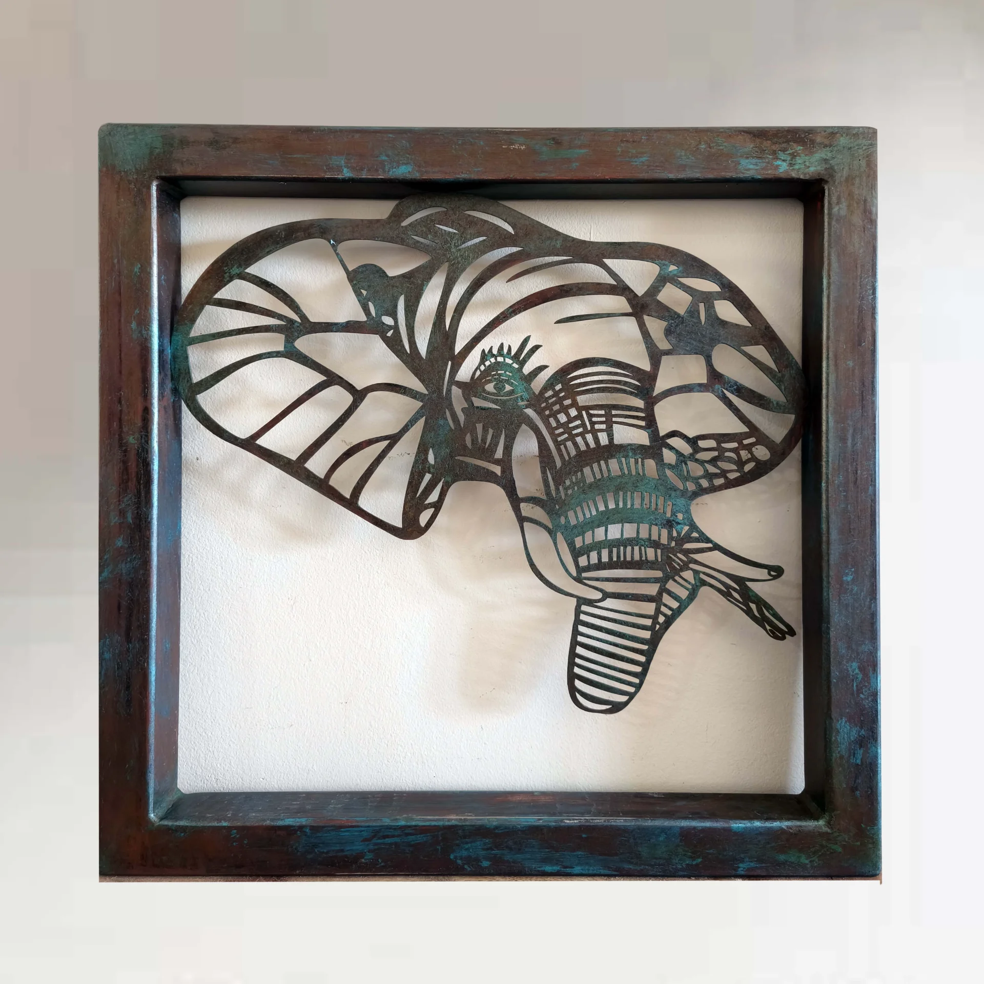 "The Third Eye" is a masterpiece born from a wild moment captured through a camera lens in the vast landscapes of Africa and brought to life as a metal sculpture blending the wisdom of the elephant with artistic precision in laser-cutting presenting an intricate silhouette centered around an eternal and conscious gaze that invites a deep connection with the power of nature combined with a deep frame and a unique corrosion finish in turquoise and copper tones that grant the sculpture an archaic character