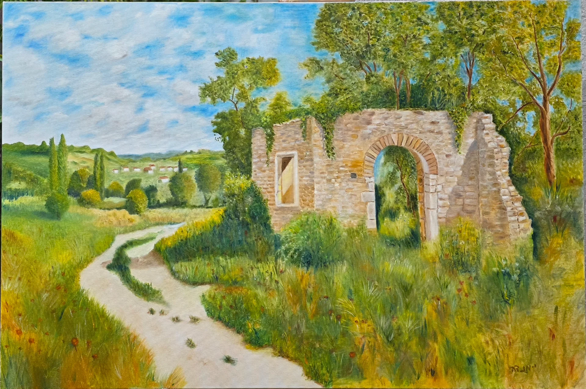 In this piece, the winding path and ancient arch create a sense of space and timeless calm. With a warm color palette of green, gold, and light blue, this painting is the perfect choice for those seeking a corner of peace and rustic beauty in their home decor.