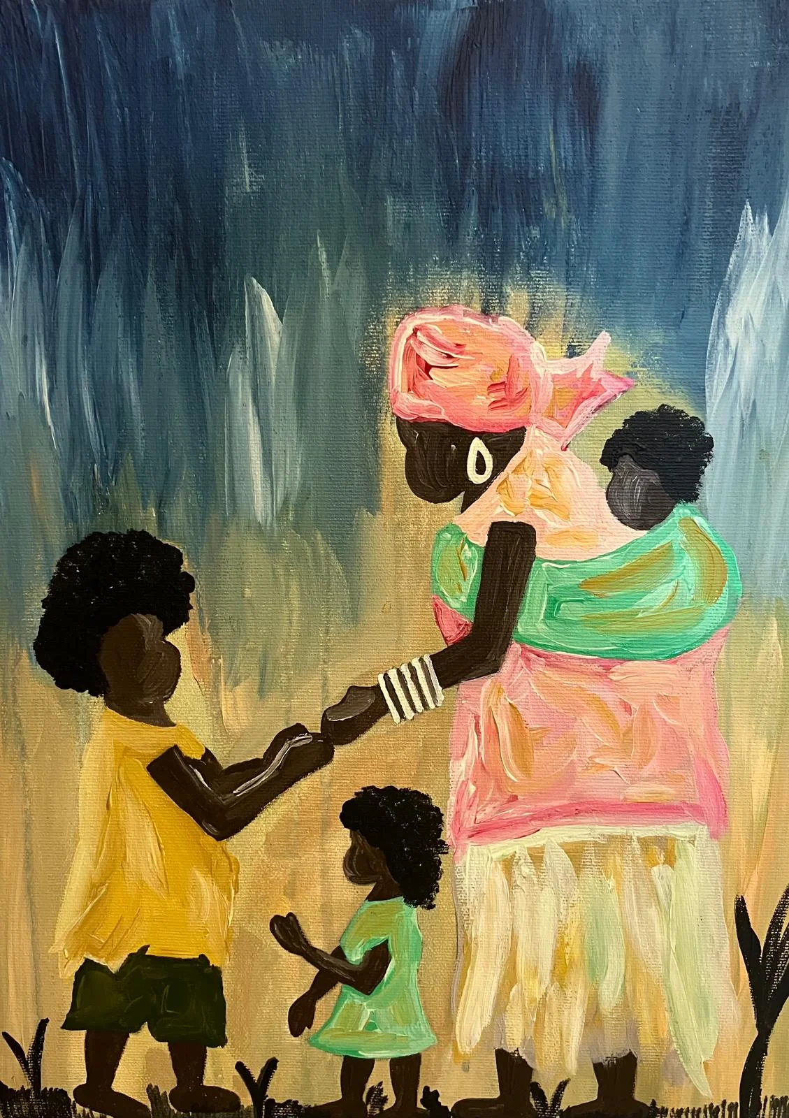 A figurative painting portraying a mother as the emotional and physical center of her family, carrying one child on her back while extending her hand to the others. Through simplified forms, expressive brushwork, and a luminous palette, the work reflects on motherhood, care, and the quiet strength required to hold a family together.