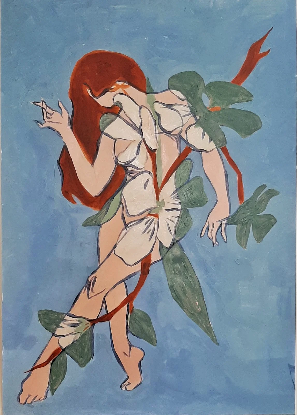 A figurative painting in soft, natural tones depicting a woman dancing in a private moment with herself, while a coarse branch covered in wildflowers divides her body like a broken puzzle. The reason for her dance is not defined for the viewer- yet she continues, immersed in a moment that is slightly fractured, but still whole. The painting reveals something intimate and fragile- something vulnerable within the viewer themselves, in those moments when they allow themselves to open up and dance alone, even as the world leaves them divided and cracked.