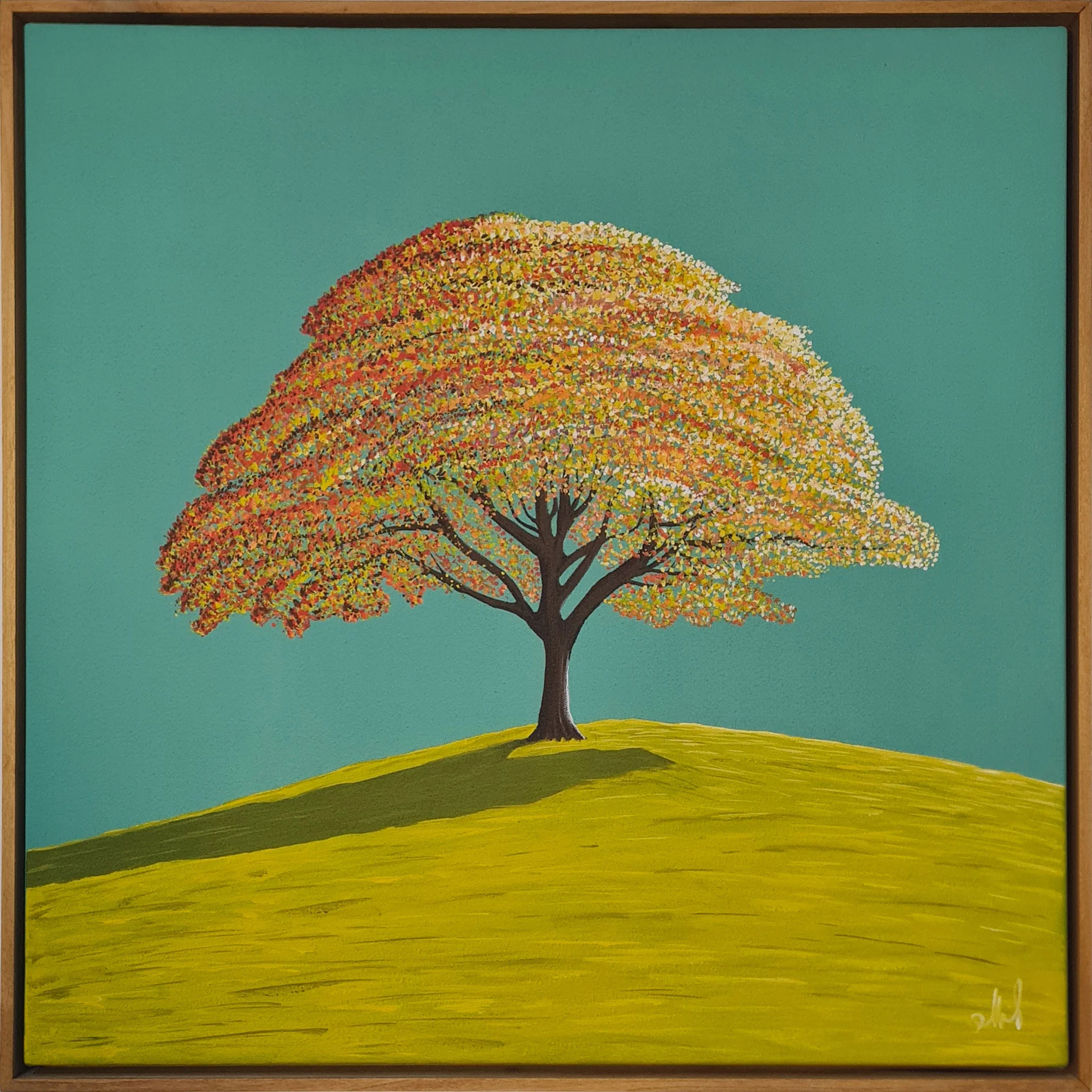 A vibrant contemporary landscape featuring a solitary tree in full bloom, rendered with dense pointillist brushwork against a luminous turquoise sky. The composition emphasizes color contrast, light, and the quiet presence of nature across an open hill.