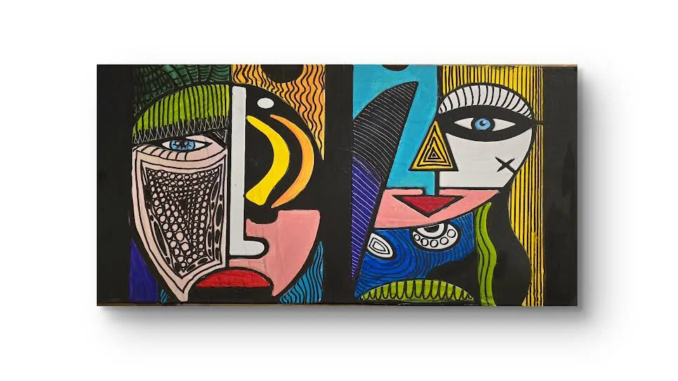 An original mixed media painting on canvas depicting two surrealist-cubist faces set against a deep black background. Through sharp linear structure, vivid color contrasts, and layered textures, the work creates a compelling dialogue between two facets of the same inner selfโone enigmatic and veiled, the other direct and assertive. Drawing on influences from cubism, pop art, and contemporary graphic language, the composition explores identity, duality, and the tension between opposing emotional states.