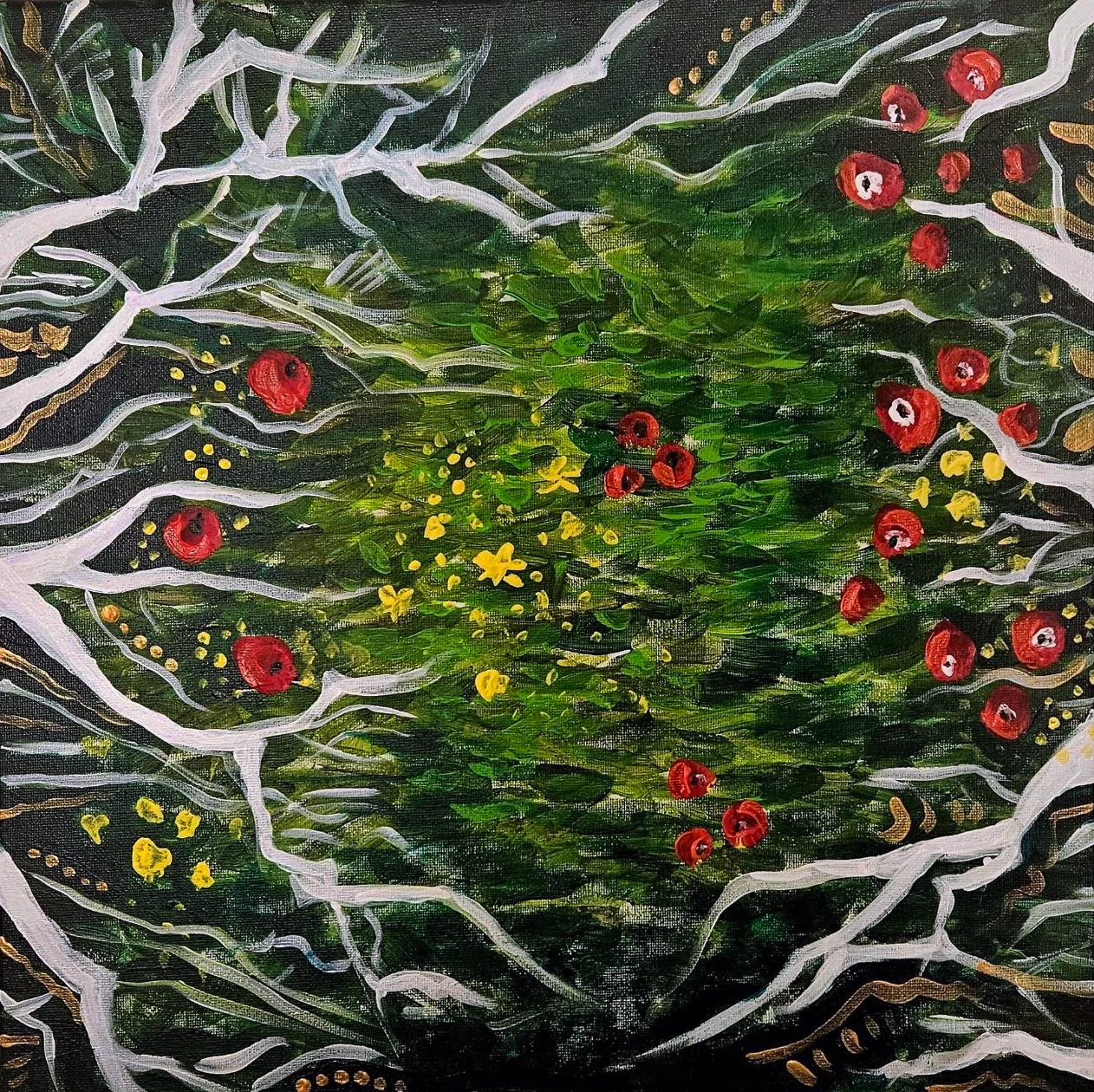 A living landscape of hidden movement - where roots, veins, and memories intertwine beneath the surface. The forest breathes quietly, holding fragments of life, tension, and fragile bloom.