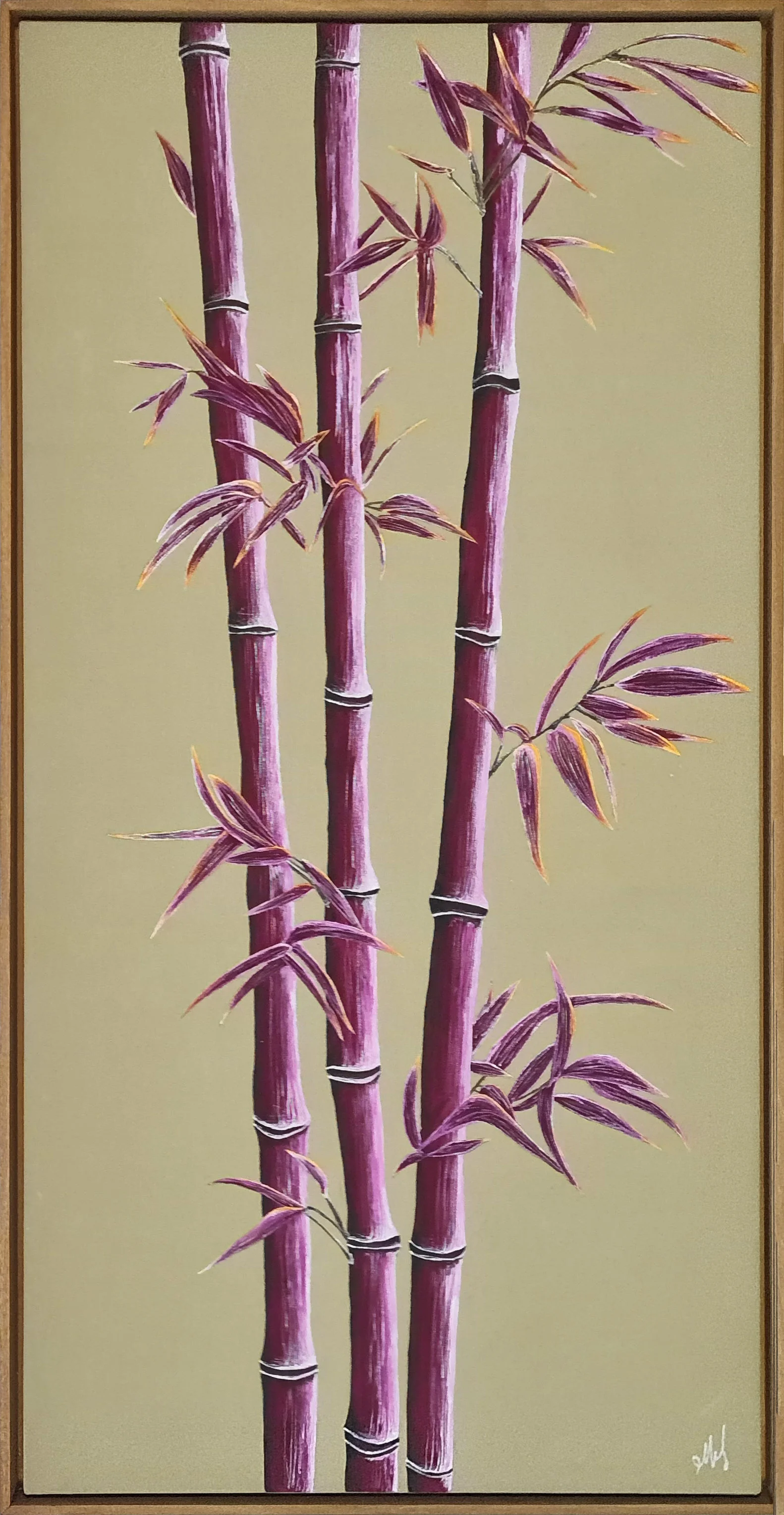 An elegant botanical composition featuring tall bamboo stalks in rich violet tones against a soft muted background. The work combines decorative refinement with a calm contemporary sensibility, emphasizing vertical rhythm, balance, and delicate brushwork.