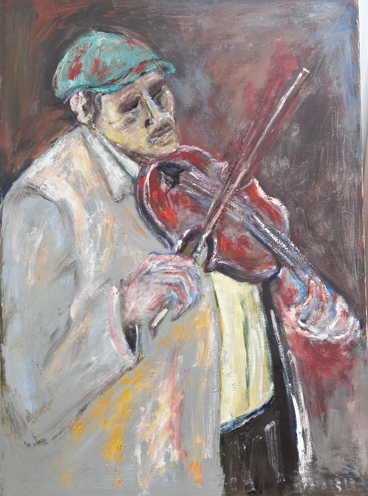 An expressive oil painting on canvas depicting a violinist in motion, rendered with loose brushwork and a muted yet vibrant palette. The composition emphasizes gesture, atmosphere, and the emotional presence of the musician.