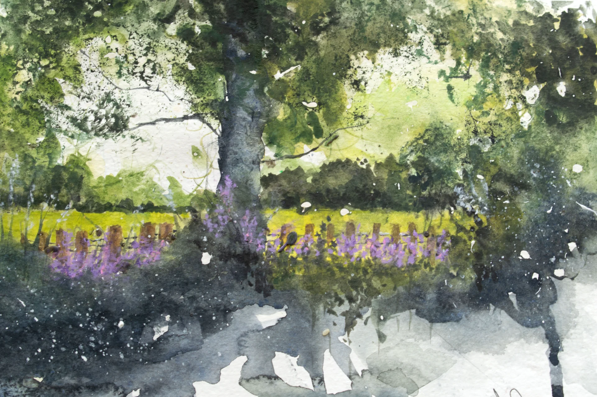 Mysterious forest mood and movement of light filtering through trees, painted in watercolor textures, splashes, for a quiet woodland feeling