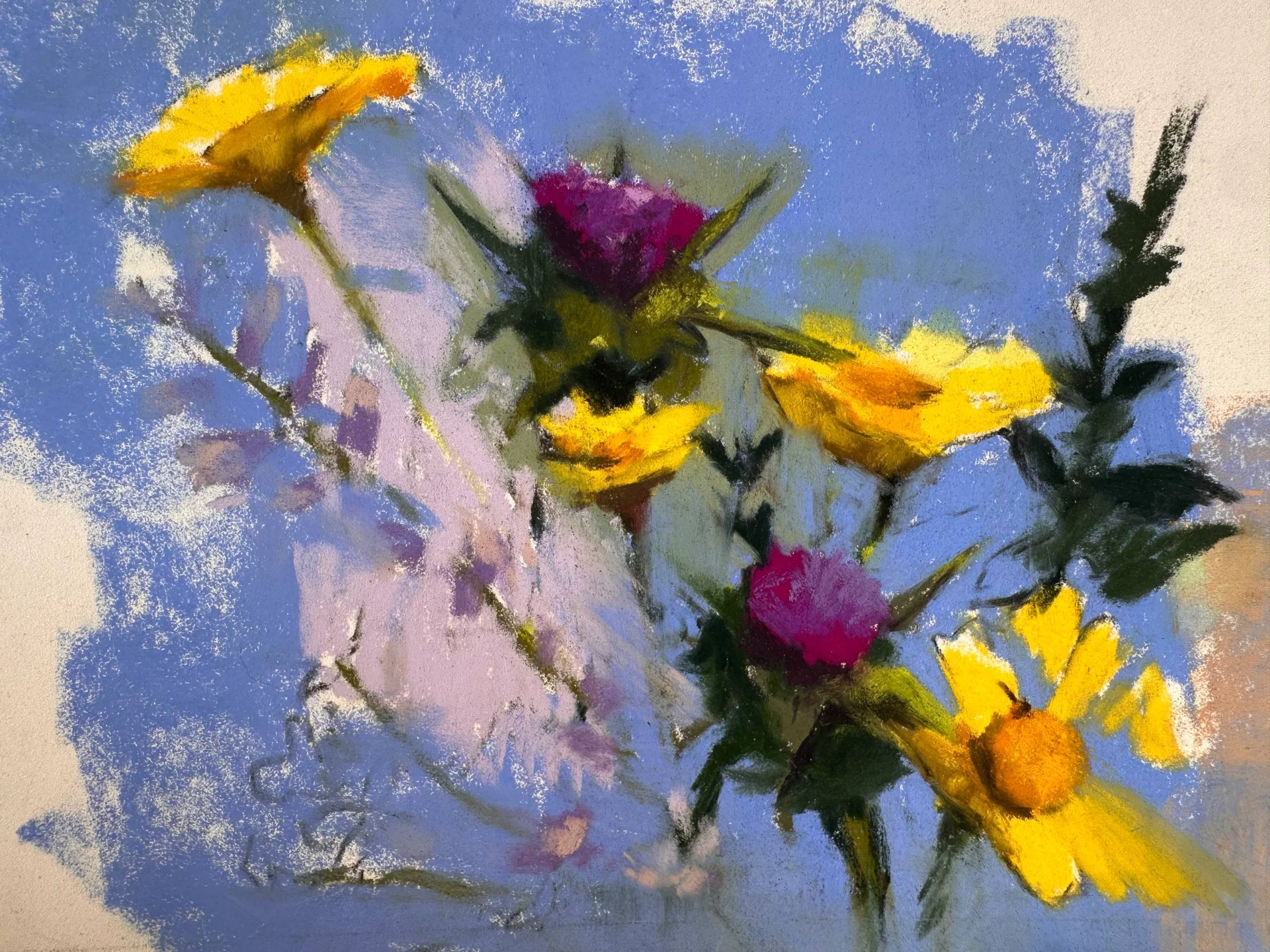 A celebration of color and spontaneous movement. This piece captures the energy of wildflowers in vivid yellows and purples, set against an airy blue background. The pastel's texture is highlighted through swift, gestural strokes, giving the artwork a sense of freshness and bursting vitality