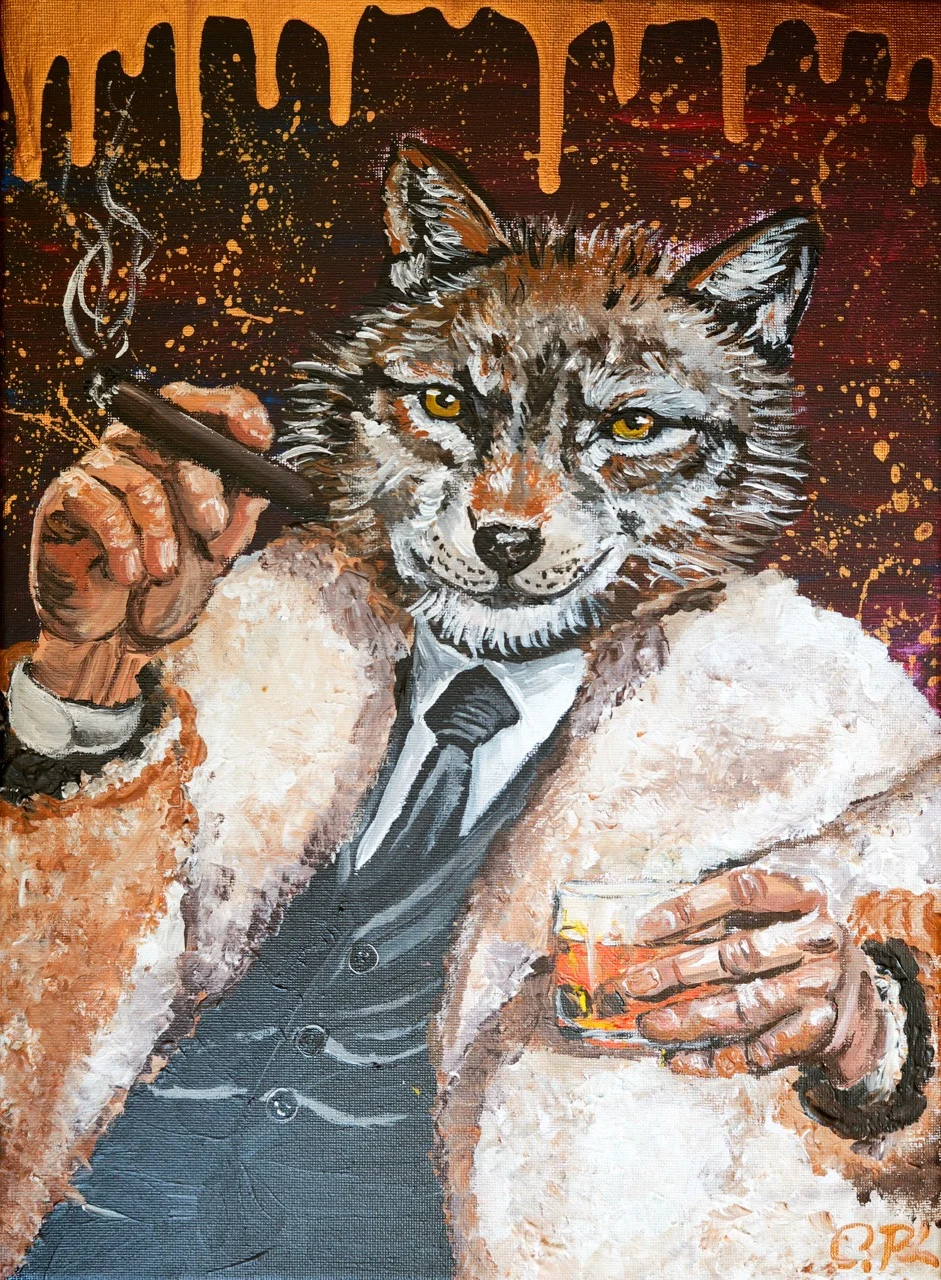 A bold, character-driven figurative painting depicting a wolf dressed in luxurious sheep's clothing, holding a cigar and whiskey glass. The work combines dark humor with a sharp visual narrative, using expressive brushwork, layered texture, and a dramatic palette to explore themes of disguise, power, and deception.